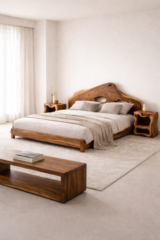 Crafted from solid acacia wood, this bedframe grounds your bedroom in quiet strength and natural beauty. The rich grain patterns form a subtle backdrop to daily rituals , morning light, evening calm, and moments of rest in between. Each line and surface reflects the honesty of the material, making every piece uniquely yours.
