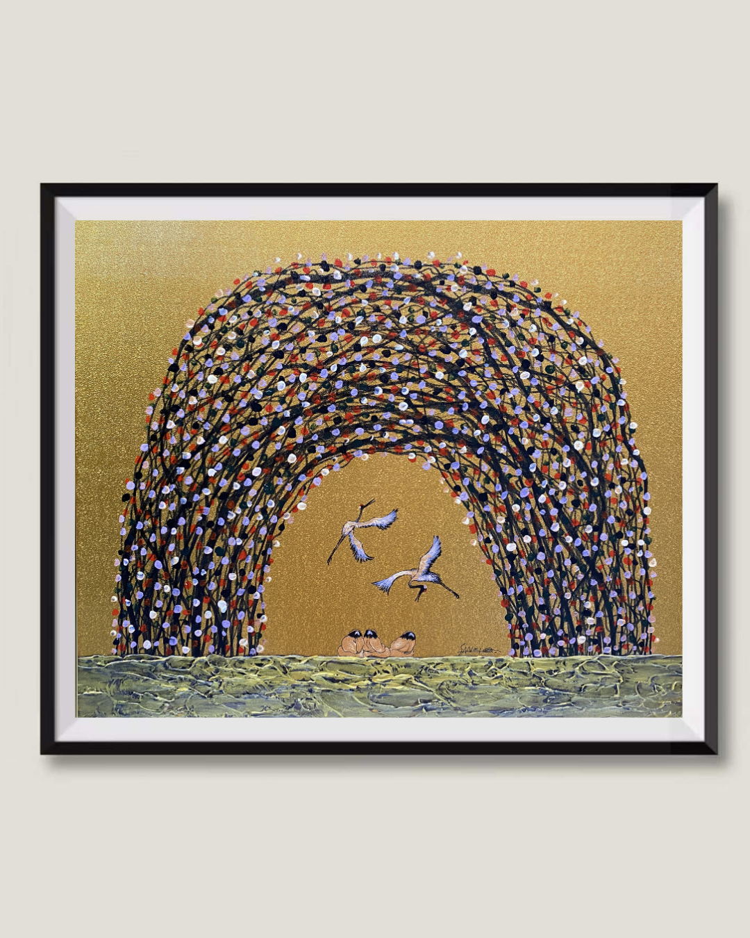 Clusters of flowers bloom in brilliance; people and cranes share their joy.